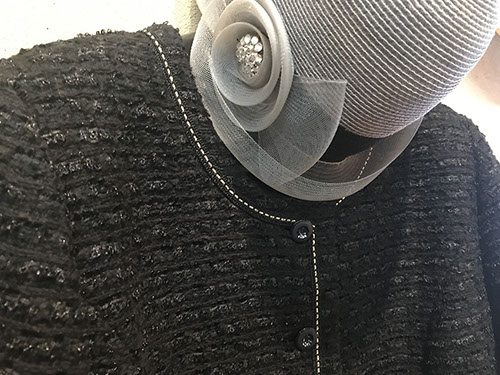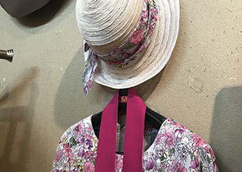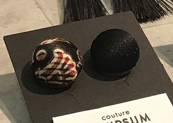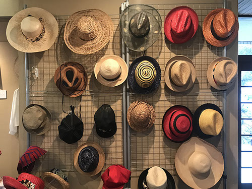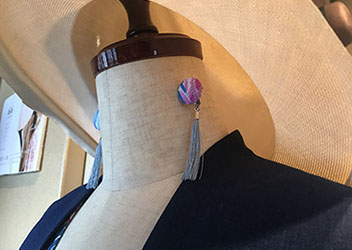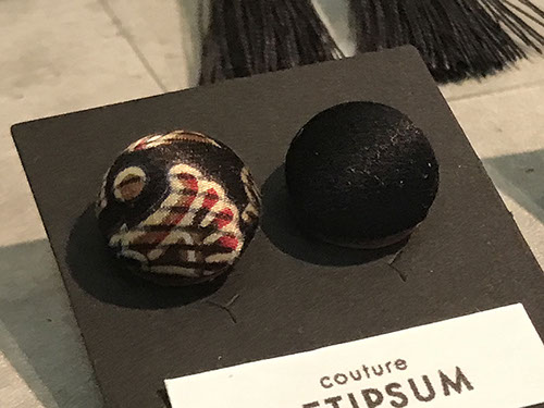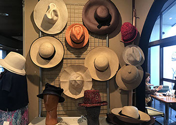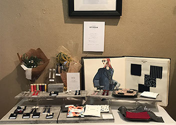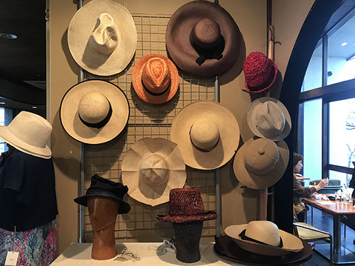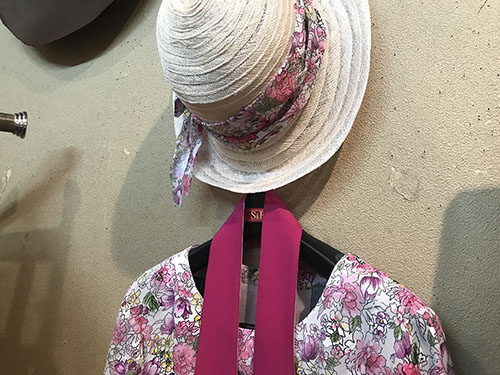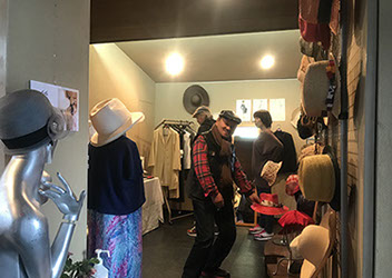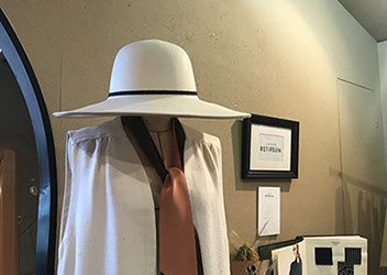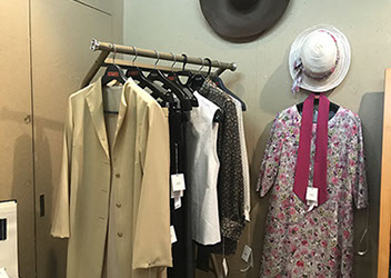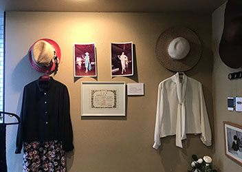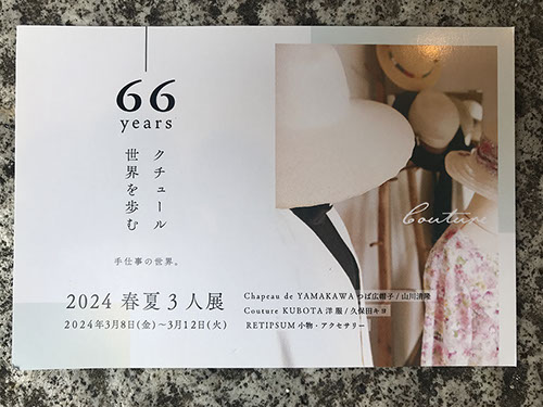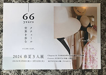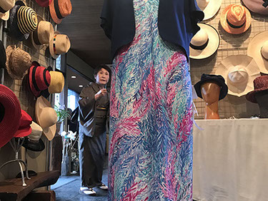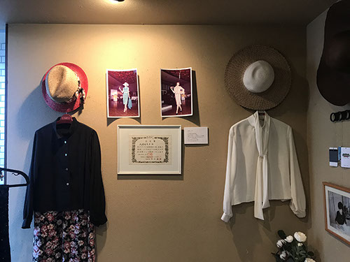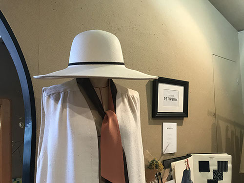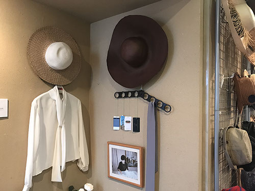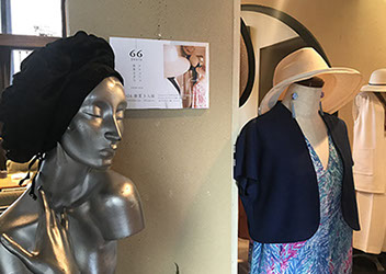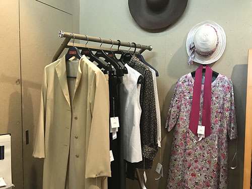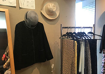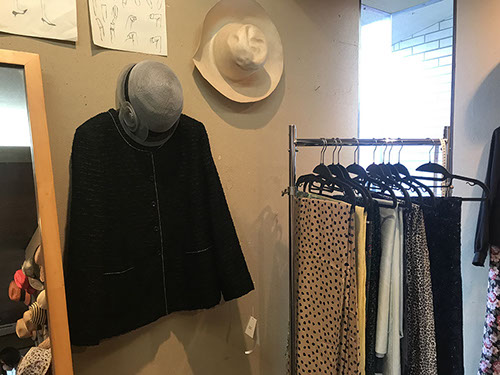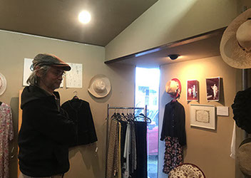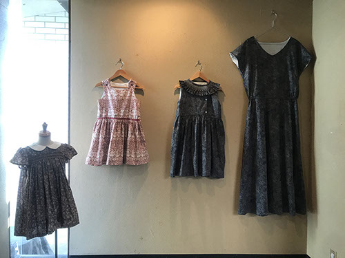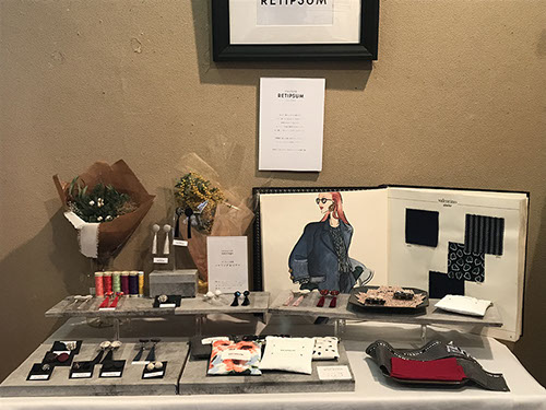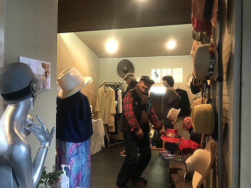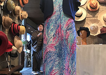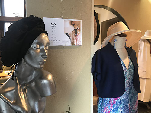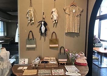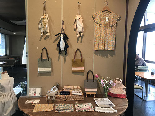 山川さんは植物素材バリバンタルを使ったつば帽子、久保田キヨさんはヨーロッパの生地で制作した洋服を、久保田さんの姪のRETIPSUMは洋服制作ででたはぎれを使ったイヤリング・布小物を展示。