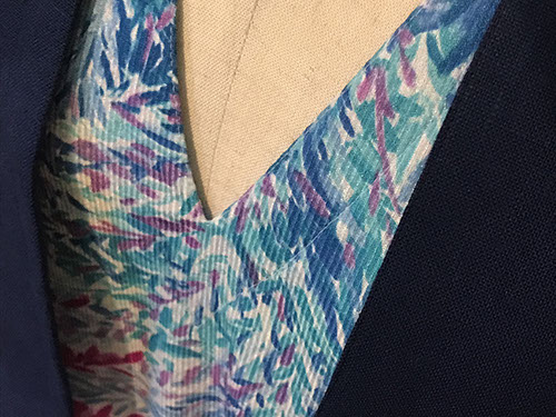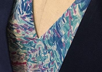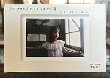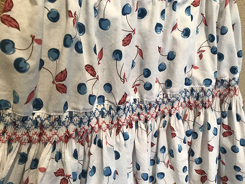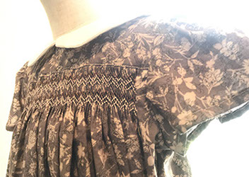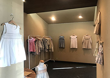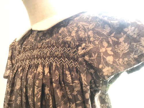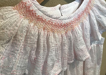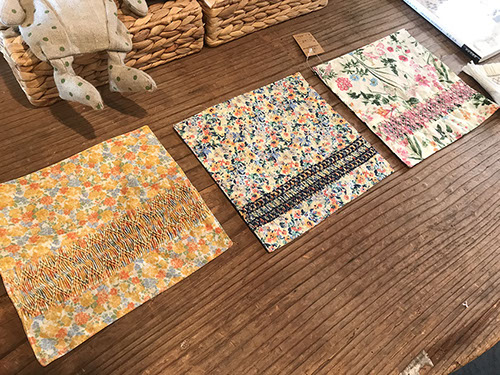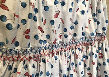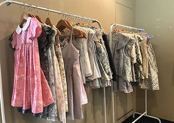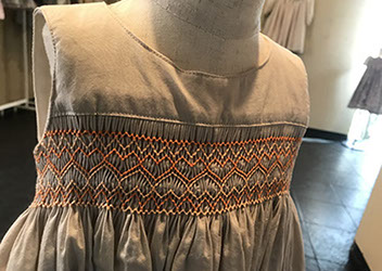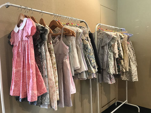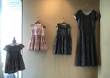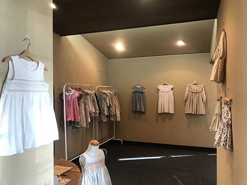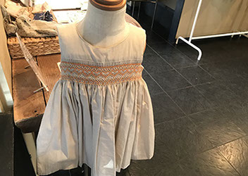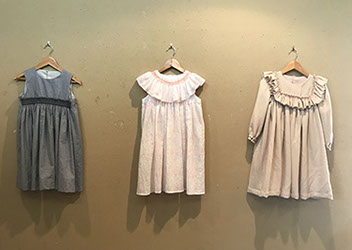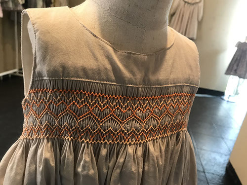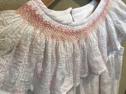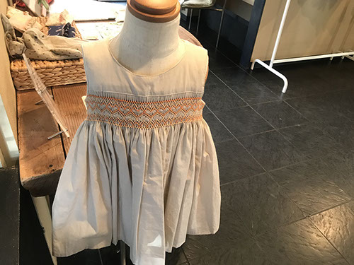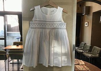 スモッキング刺しゅうの洋服、布小物の展示。自分の子供に着せたいという思いからスモッキングを習い始めた。