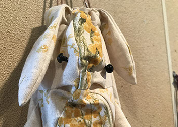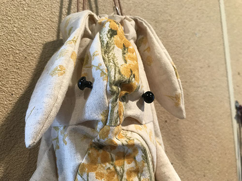 服作りでのはぎれでつくったウサギ型の巾着やバッグが楽しい。