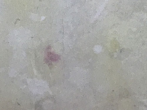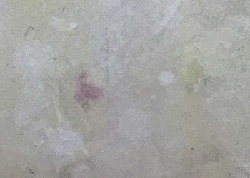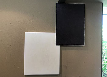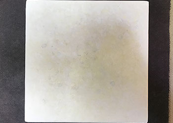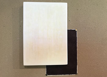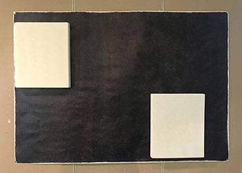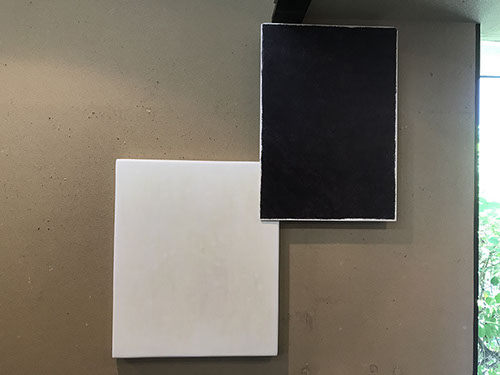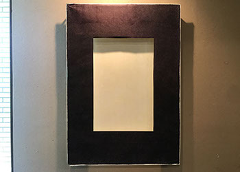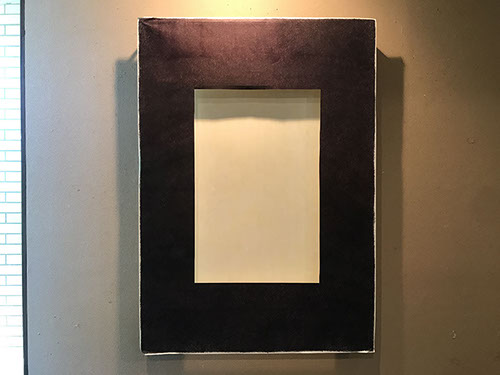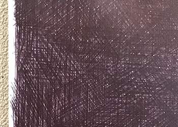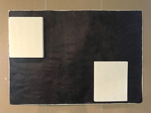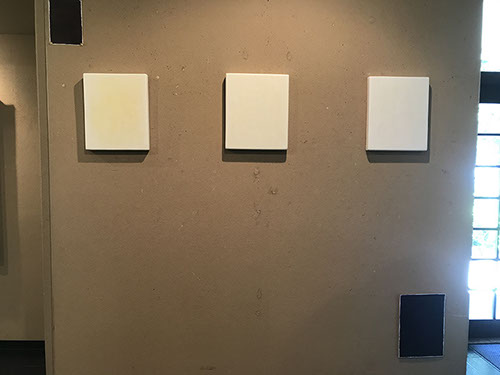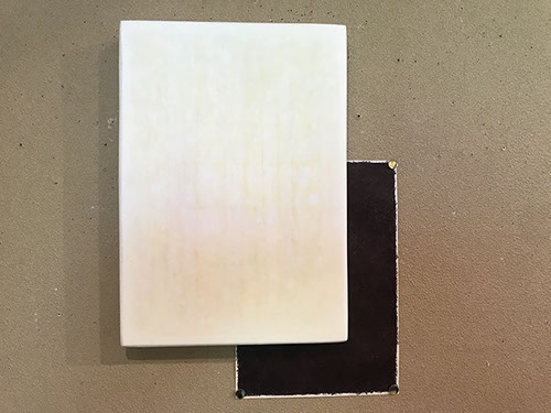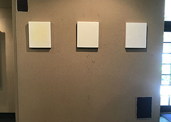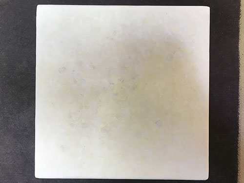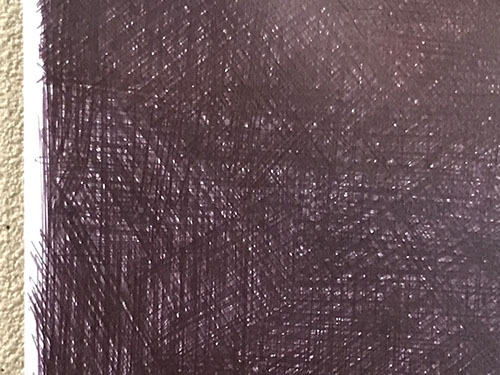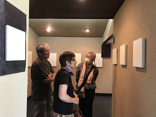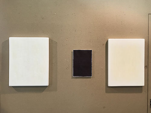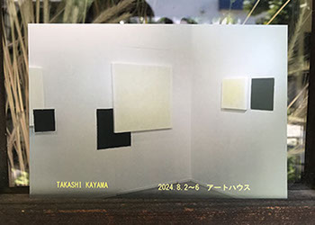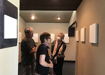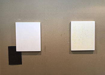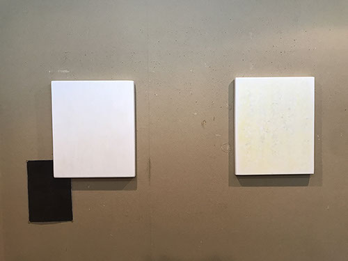 パネルにジェッソを塗った後、乾いたらサンドペーパーで削る、この工程を数十回繰り返す、遠目には白一色だが近くによると染みなどがなどがまだらに浮かんでいるのがわかる。加山自身、自分の思いというより、何かに突き動かされるような感じでこの白い作品を制作している。悲しみや苦しさに耐え、心の奥から湧き上がる感覚を基にひたすら筆を走らせる。今回は白に黒の画面に塗り込められた精神の深さを感じられたらうれしい。