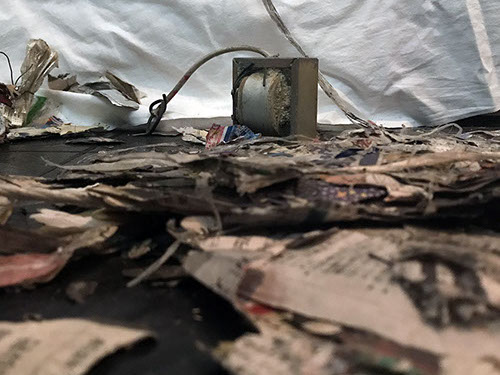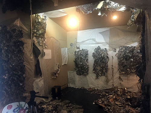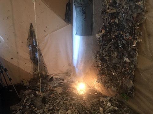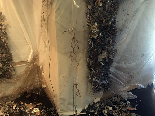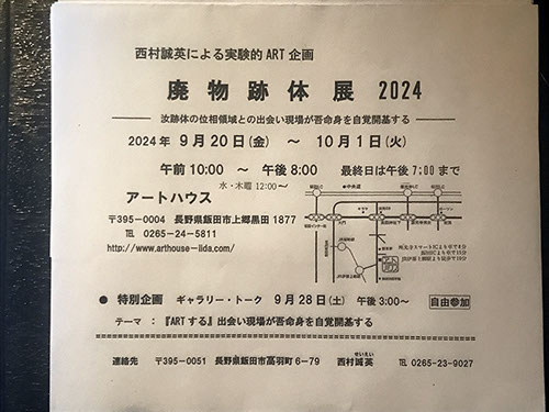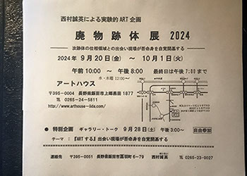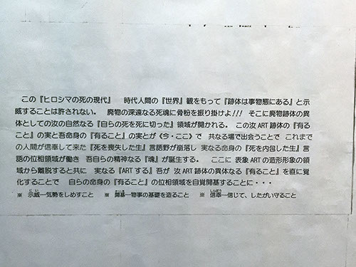 作家の表現のための素材として物を扱うのではなく行為によって現れた物自体と人が一対一で出会える物所を作り出す事を試みて表現という行為を感じさせない会場作りを心掛けていると言っている。