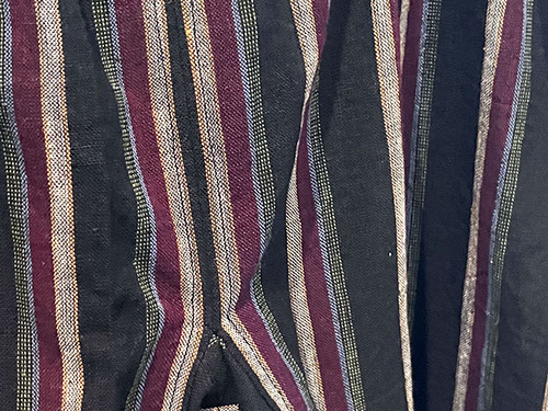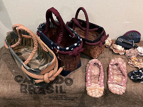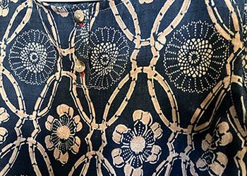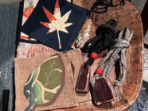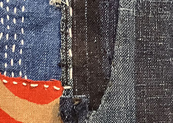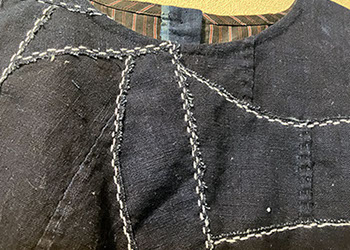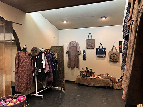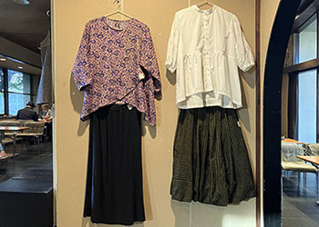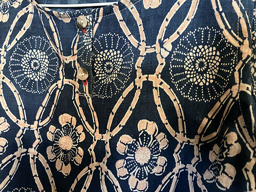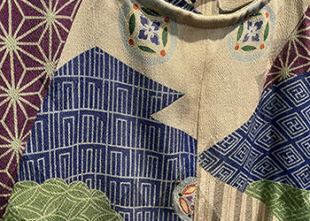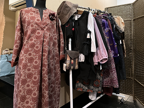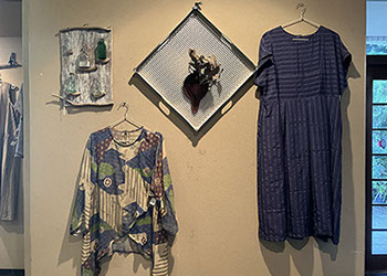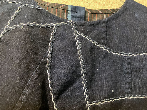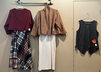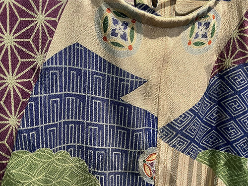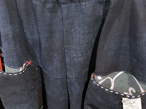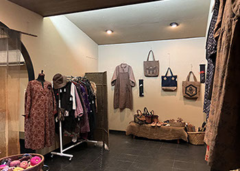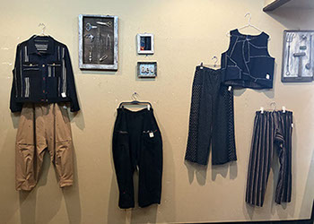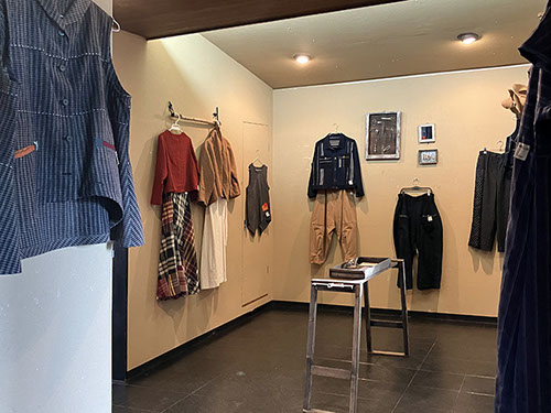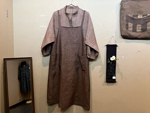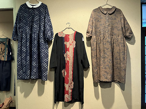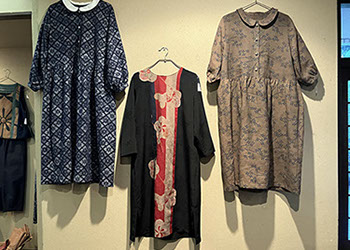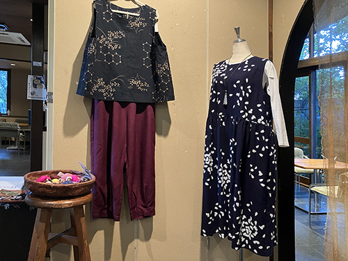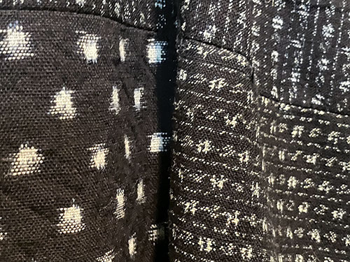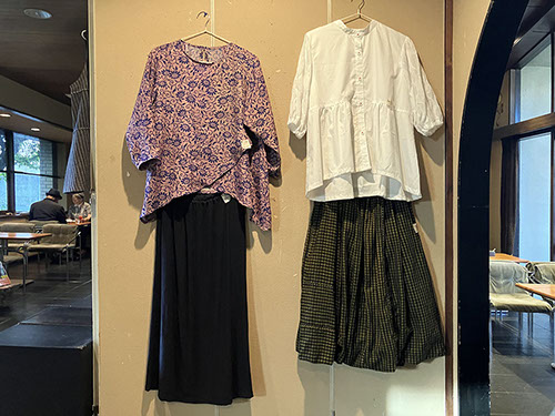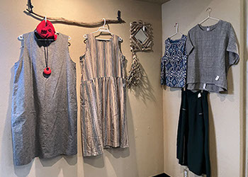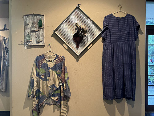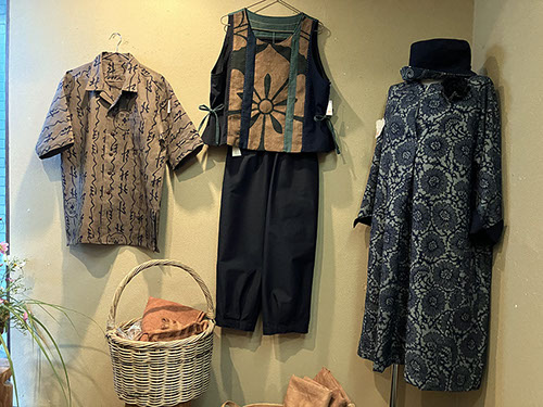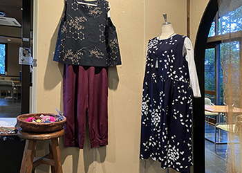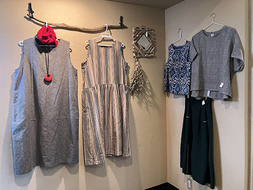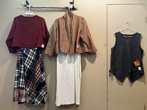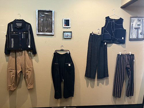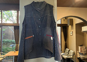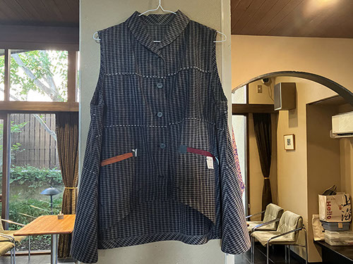 収集している古布を使って、複数の絣生地を組み合わせたボトムス、きれを接いで仕立てたベストなど少ししかない生地でも、取り合わせしだいで極上の楽しみがうまれると思いながらの服展。