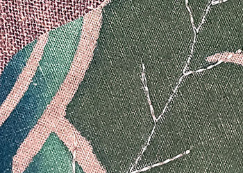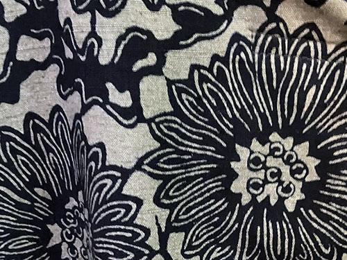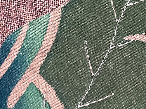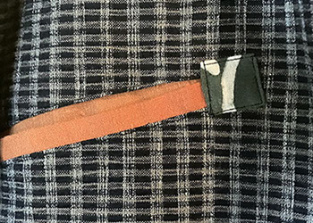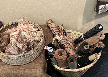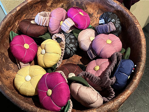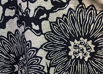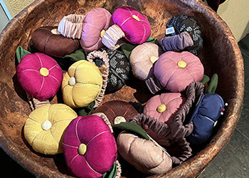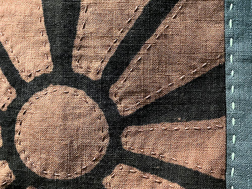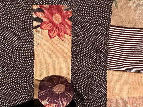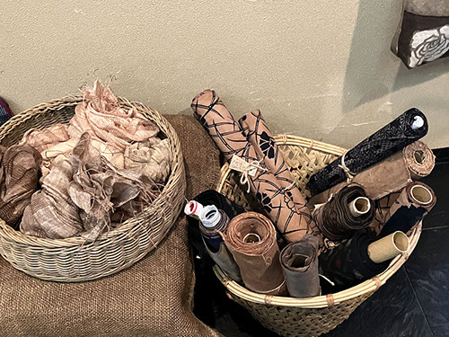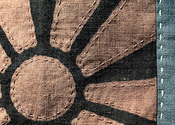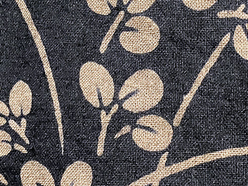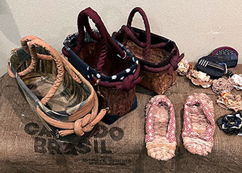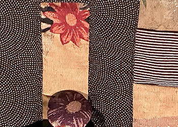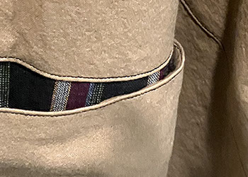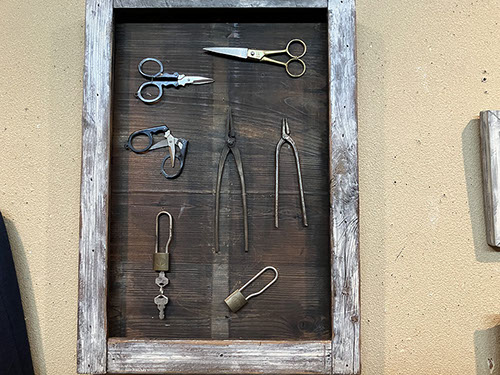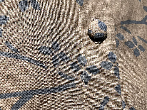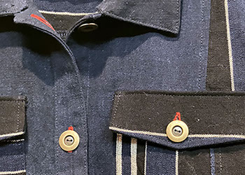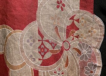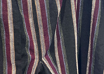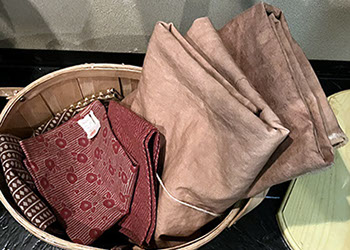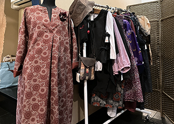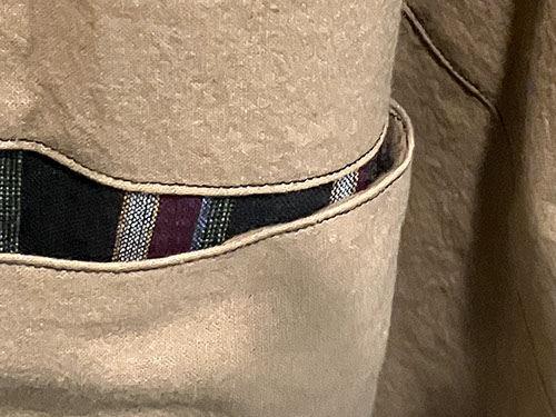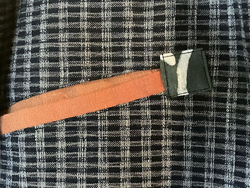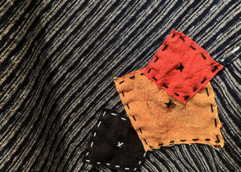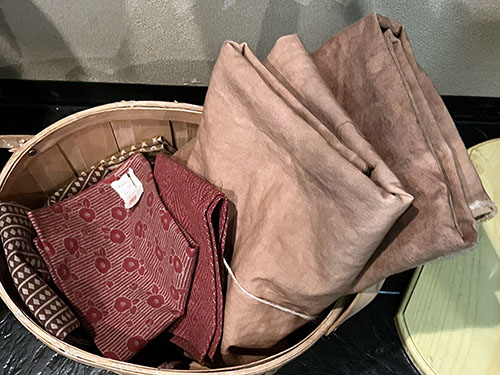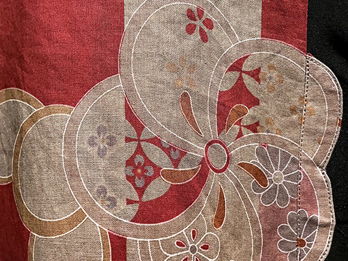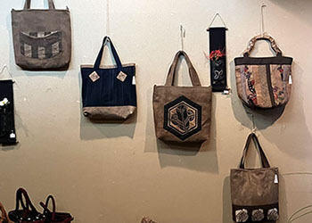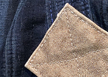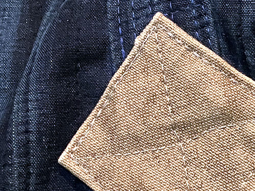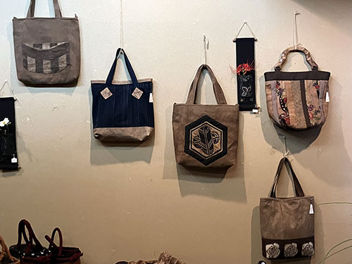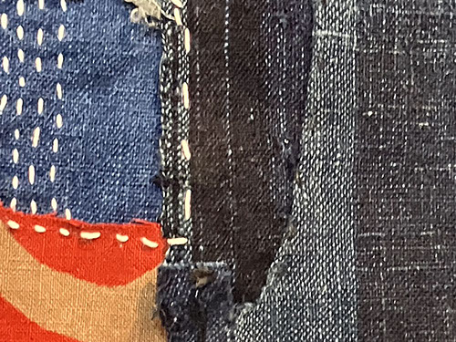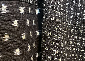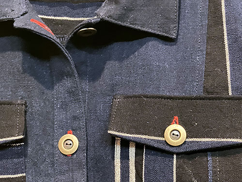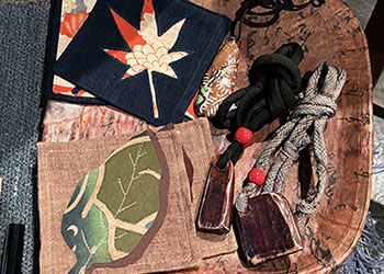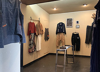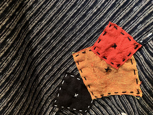 収集している古布を使って、複数の絣生地を組み合わせたボトムス、きれを接いで仕立てたベストなど少ししかない生地でも、取り合わせしだいで極上の楽しみがうまれると思いながらの服展。