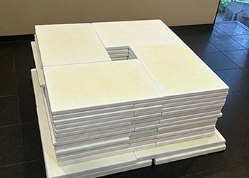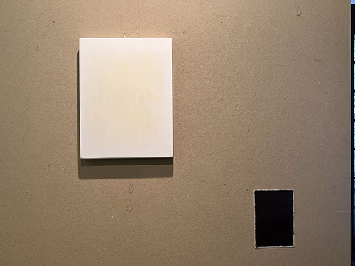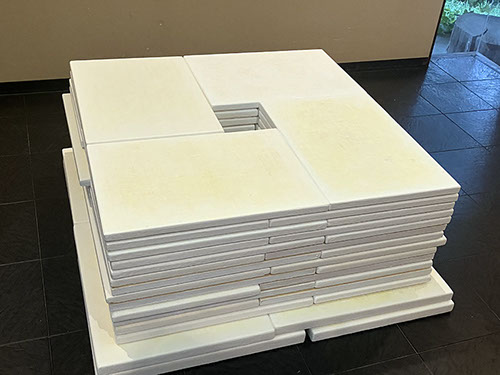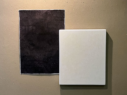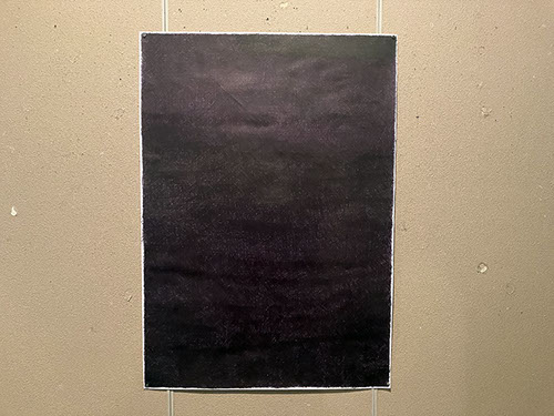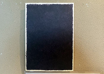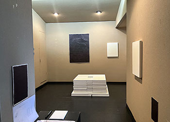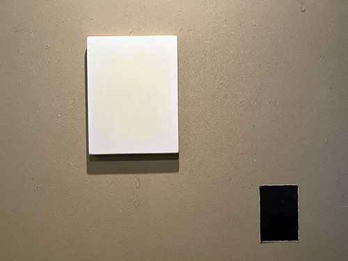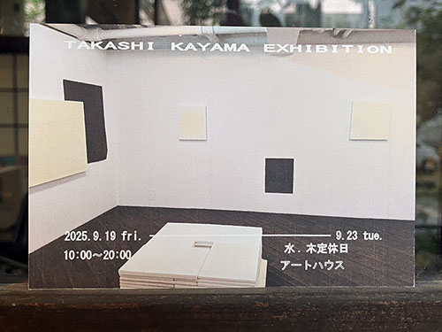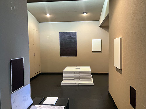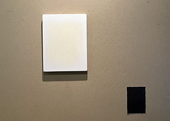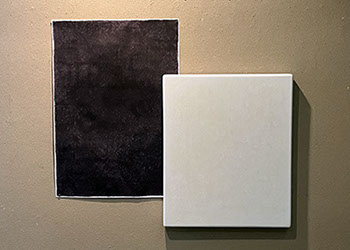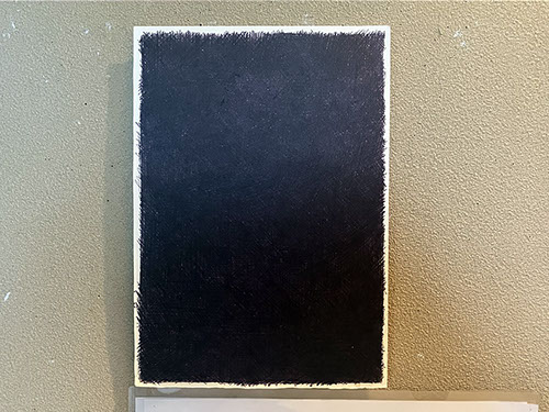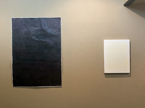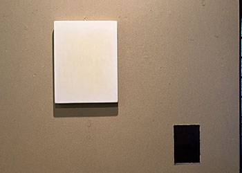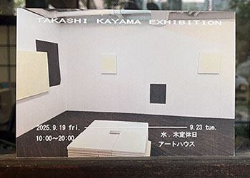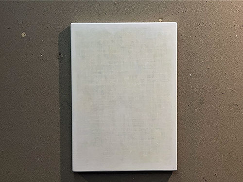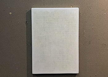 ほとんど白い画面にほんのりと黄色の筋や形状が見られる加山隆の作品。この何年も白い地塗り剤と透明感のある黄色い顔料を薄く塗り重ねては表面を磨いてゆく作業を続けている。その仕事を重ねてゆくうちに描いている絵から何かが生まれてくるという不思議な感覚を加山隆が感じはじめているという。ひたすら筆を重ねているとその作品から生まれている何かが次回の展示会にどんな表現になってみせていただけるだろうか。